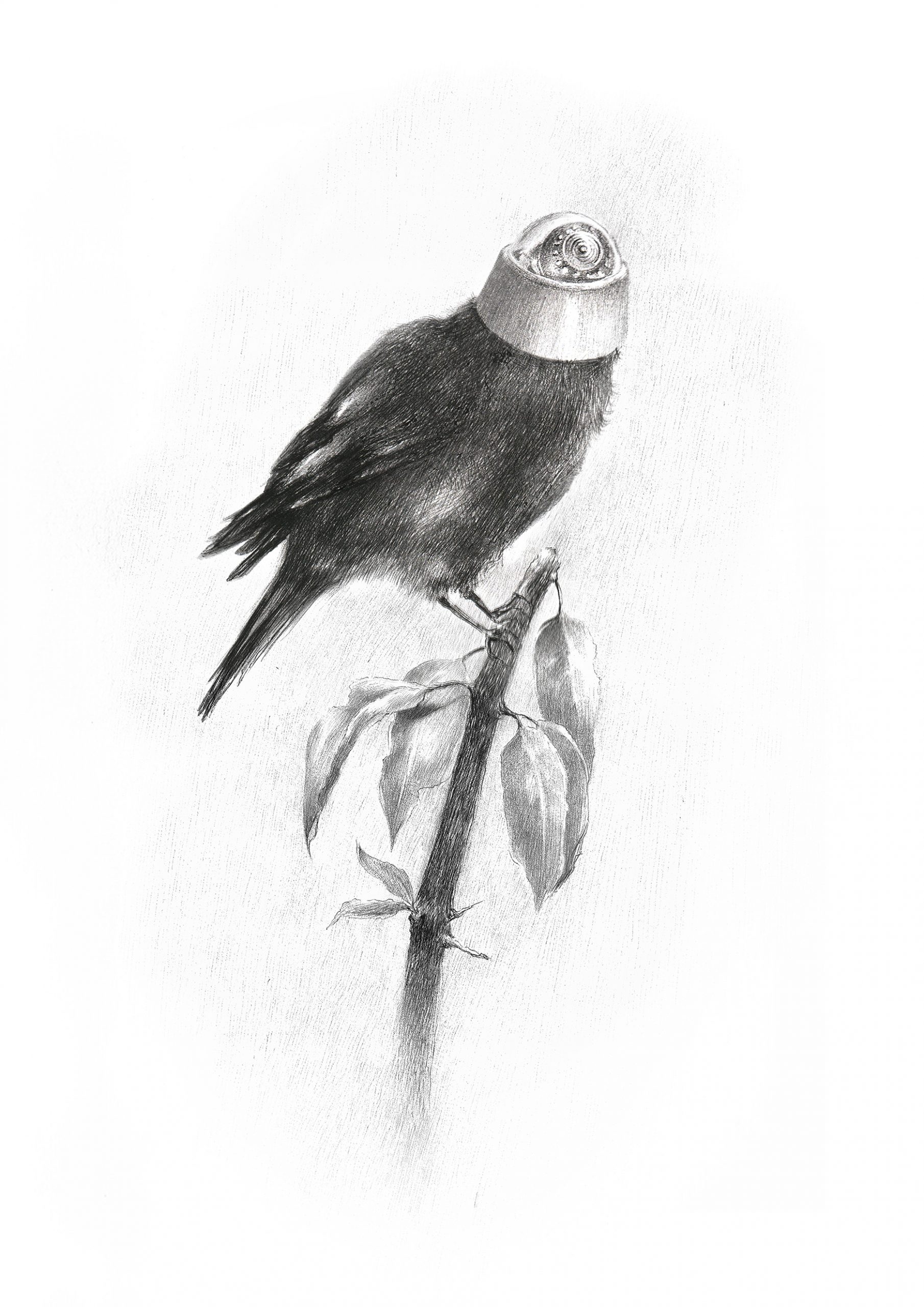 A ball pen drawing of a CCTV bird perched on a tree branch. This high quality art print is part of CCTVYLLE fine art series. Take a look at the “Description” area below for more images, details (print size specifications), and to get an idea of how the art work may look in a home or office environment.
